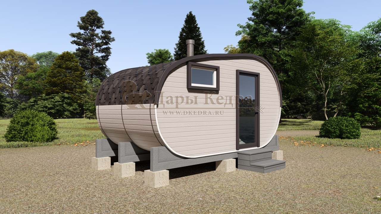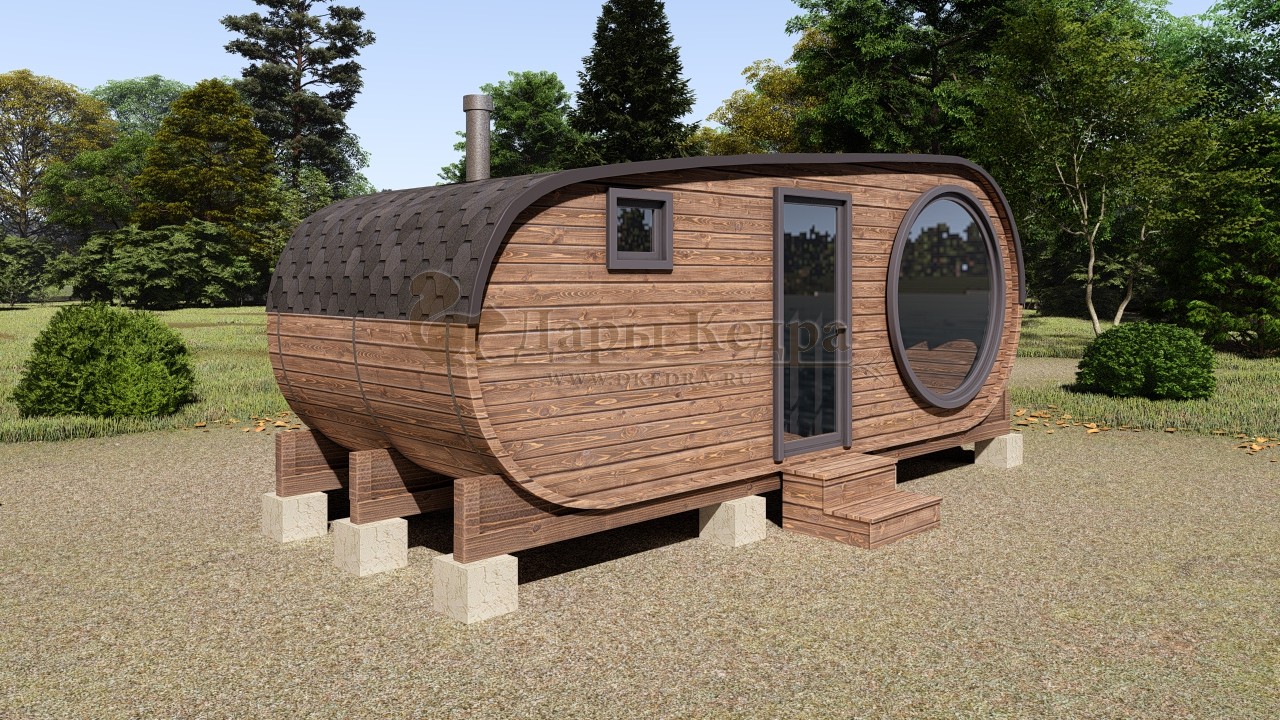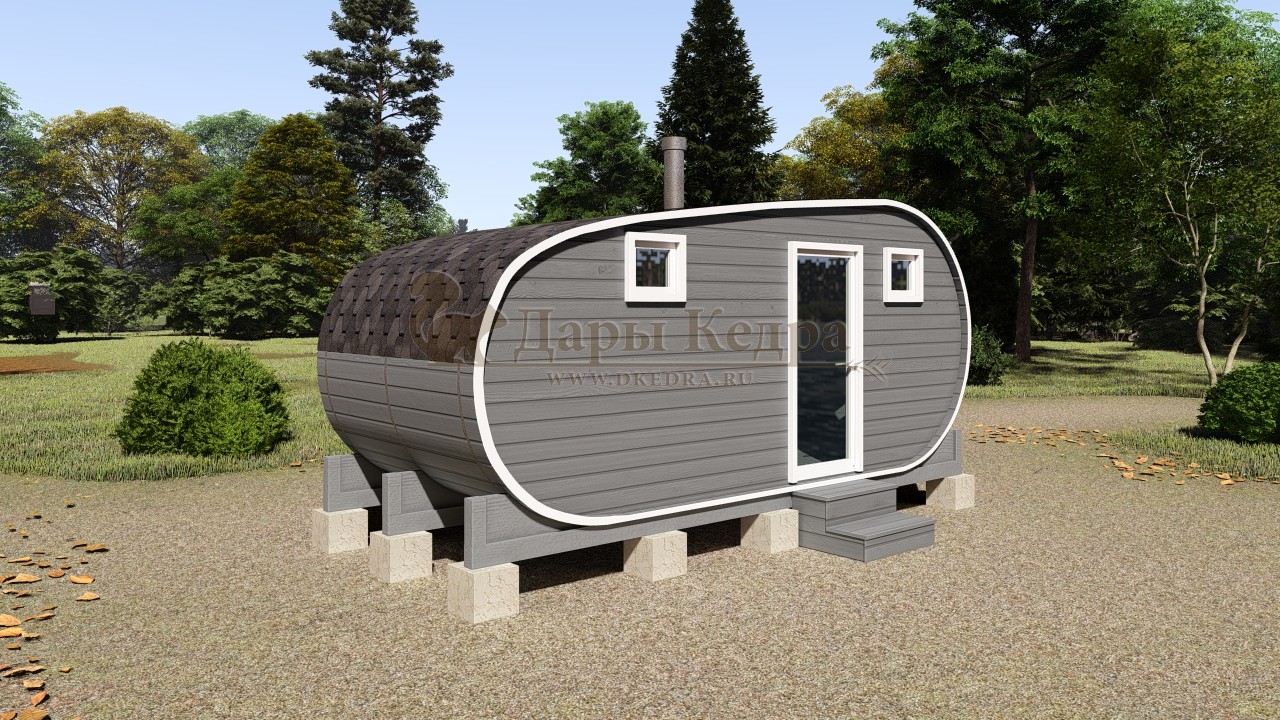 Симбиоз круглой и квадратной бани-бочки. Разработано с учётом эргономики, в ней так же просторно, как и в квадро-бочке, но при этом полукруглая крыша не дает задерживаться снегу и влаге на кровле. А еще такая баня безусловно красивая, мобильная и доступная каждому!