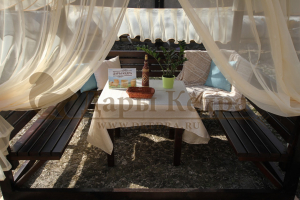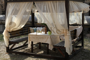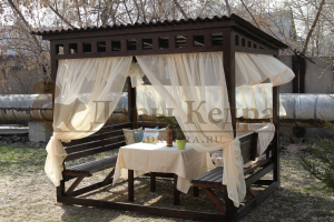 Беседка выполнена из кедра. На крыше - ондулин. Конструкция отличается простотой в установке, легкостью, долговечностью, прочностью и классическим дизайном, который впишется в любой интерьер приусадебного участка. Вокруг неё можно организовать ландшафт из вьющихся растений, которые красиво создадут зеленые "стены" снаружи и уют внутри.