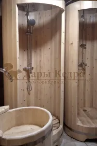 Древесина кедра богата эфирными маслами, которые при воздействии температур испаряются в воздух, что благотворно воздействует на организм во время принятия душа.