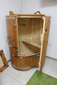 Овальная фитобочка из кедра - это мини парная, которую можно использовать не только в спа-салонах, но и дома. Овальная модель более просторна и удобна в использовании. Толщина стенок составляет 40-45 мм, что позволяет увеличить срок службы изделия. Она оборудована откидными створками, дверцей и отверстием для головы. Во время парения человек сидит внутри кедровой бочки, а голова находится снаружи. Благодаря этому исключается возможность перегрева. Подлокотники из кедра, встроенные ручки на створках и двери делают эксплуатацию более удобной.