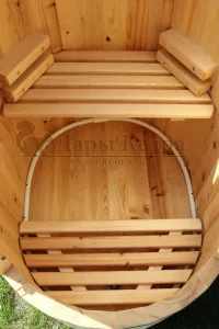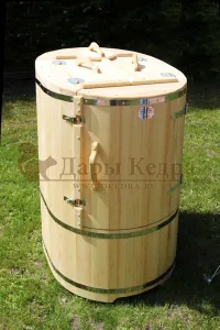 Овальная фитобочка из кедра - это мини парная, которую можно использовать не только в спа-салонах, но и дома. Овальная модель более просторна и удобна в использовании. Толщина стенок составляет 40-45 мм, что позволяет увеличить срок службы изделия. Верхний скос делает положение головы более комфортным и улучшает обзор. Она оборудована откидными створками, дверцей и отверстием для головы. Во время парения человек сидит внутри кедровой бочки, а голова находится снаружи. Благодаря этому исключается возможность перегрева. Подлокотники из кедра, встроенные ручки на створках и двери делают эксплуатацию более удобной.