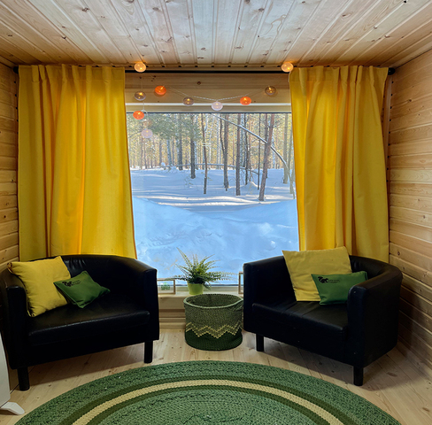 - Утеплённый зимний кемпинг-дом «Панорама»: Современный дизайн с большим окном для максимального естественного освещения и вида на природу.