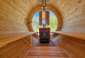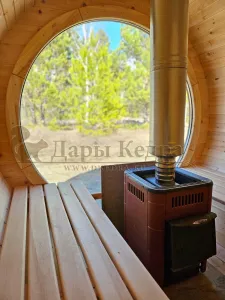 Стильная и современная баня-бочка может быть выполнена длиною от 3 метров, что-бы парильное отделение было не менее 2,5 метров для безопасного расстояния человека от печи. Полок одноуровневый, что позволяет в полной мере наслаждаться видом из панорамного окна. Печь идёт с внутренней топкой по центру, её можно установить сбоку с топкой внутри, снаружи, либо вынести топку в соседнее отделение. Печь можно укомплектовать баком для воды, а саму баню сделать длиною до 6 метров, комфортно разместив в ней дополнительно помывочную и комнату отдыха.