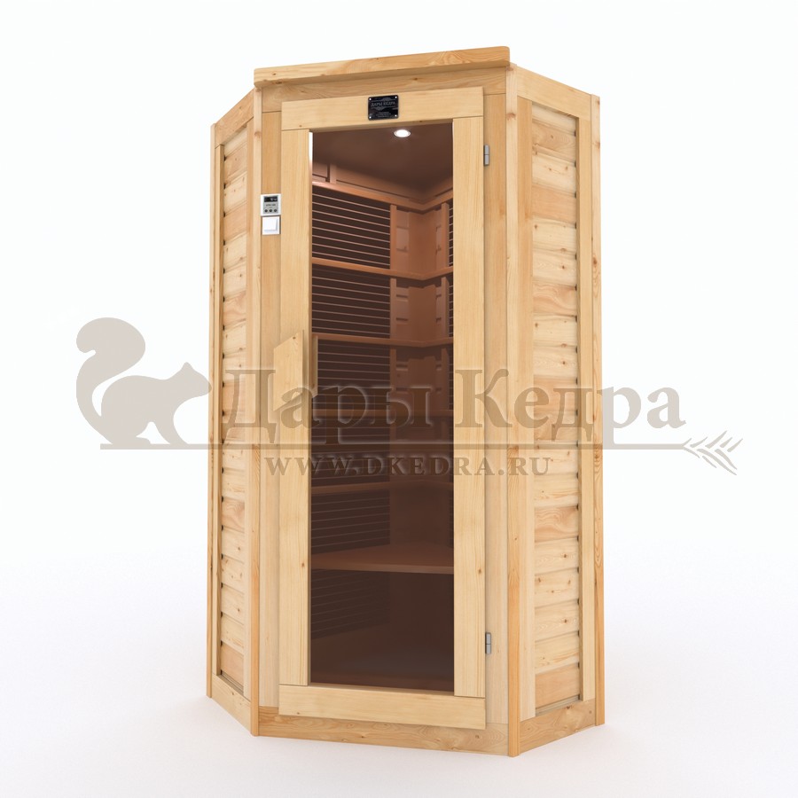 Это специально оборудованная кедровая кабина для прогрева тела человека сухим теплом. Воздух в таких парных не нагревается. Инфракрасные лучи воздействуют на тело, равномерно прогревая мышцы, суставы и органы. Карбоновые излучатели, встроенные в стены кабины, обладают мягким прогревом, что полностью исключает возможность ожога. Работает кабина за счет электричества. Установка сауны в угол, позволяет рационально использовать пространство помещения. Подходит как для домашнего использования, так и для коммерции.